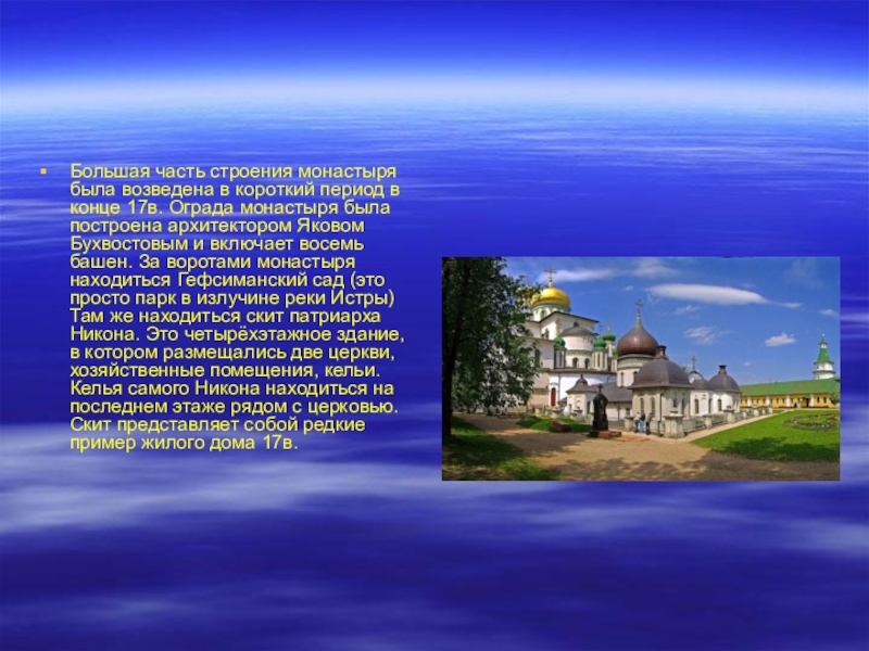 17в. Ограда монастыря была построена архитектором Яковом Бухвостовым и включает восемь башен. За воротами монастыря находиться Гефсиманский сад (это просто парк в излучине реки Истры) Там же находиться скит патриарха Никона. Это четырёхэтажное здание, в котором размещались две церкви, хозяйственные помещения, кельи. Келья самого Никона находиться на последнем этаже рядом с церковью. Скит представляет собой редкие пример жилого дома 17в.