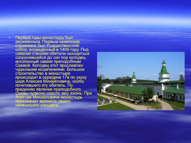 возведённый в 1405 году. Под самыми стенами обители находиться сохранившейся до сих пор колодец, ископанный самим преподобным Саввой. Колодец этот прославлен чудесными исцелениями. Большое строительство в монастыре происходит в середине 17в по указу царя Алексея Михайловича, особо почитавшего эту обитель. По преданию явление преподобного Саввы чудесно спасло ему жизнь. При Алексее Михайловиче монастырь переживает времена своего наивысшего расцвета.