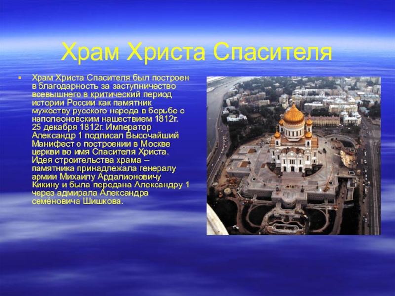 всевышнего в критический период истории России как памятник мужеству русского народа в борьбе с наполеоновским нашествием 1812г. 25 декабря 1812г. Император Александр 1 подписал Высочайший Манифест о построении в Москве церкви во имя Спасителя Христа. Идея строительства храма – памятника принадлежала генералу армии Михаилу Ардалионовичу Кикину и была передана Александру 1 через адмирала Александра семёновича Шишкова.