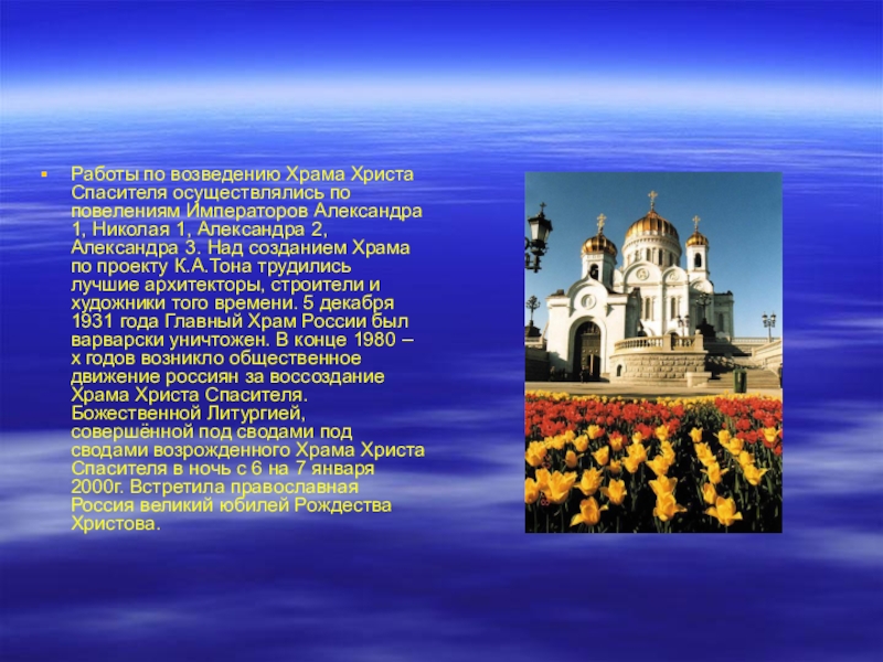 1, Николая 1, Александра 2, Александра 3. Над созданием Храма по проекту К.А.Тона трудились лучшие архитекторы, строители и художники того времени. 5 декабря 1931 года Главный Храм России был варварски уничтожен. В конце 1980 – х годов возникло общественное движение россиян за воссоздание Храма Христа Спасителя. Божественной Литургией, совершённой под сводами под сводами возрожденного Храма Христа Спасителя в ночь с 6 на 7 января 2000г. Встретила православная Россия великий юбилей Рождества Христова.