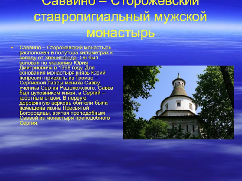 полутора километрах к западу от Звенигорода. Он был основан по указанию Юрия Дмитриевича в 1398 году. Для основания монастыря князь Юрий попросил приехать из Троице – Сергиевой лавры монаха Савву, ученика Сергия Радонежского. Савва был духовником князя, а Сергий – крёстным отцом. В первую деревянную церковь обители была помещена икона Пресвятой Богородицы, взятая преподобным Саввой из монастыря преподобного Сергия.