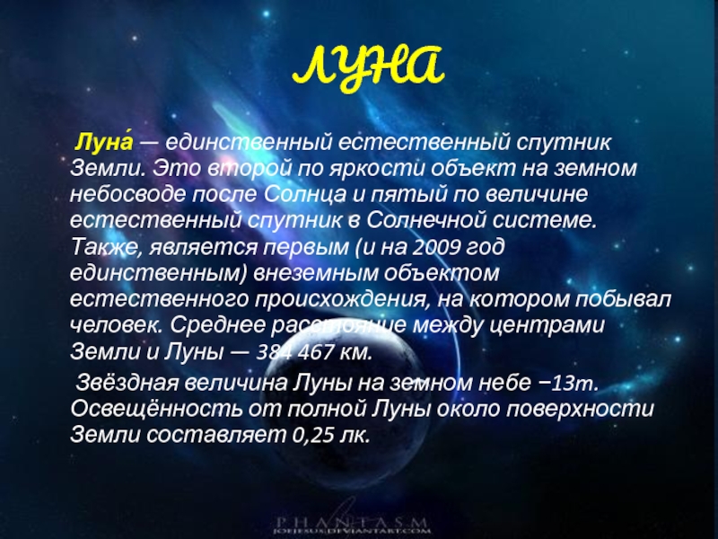 яркости объект на земном небосводе после Солнца и пятый по величине естественный спутник в Солнечной системе. Также, является первым (и на 2009 год единственным) внеземным объектом естественного происхождения, на котором побывал человек. Среднее расстояние между центрами Земли и Луны — 384 467 км.