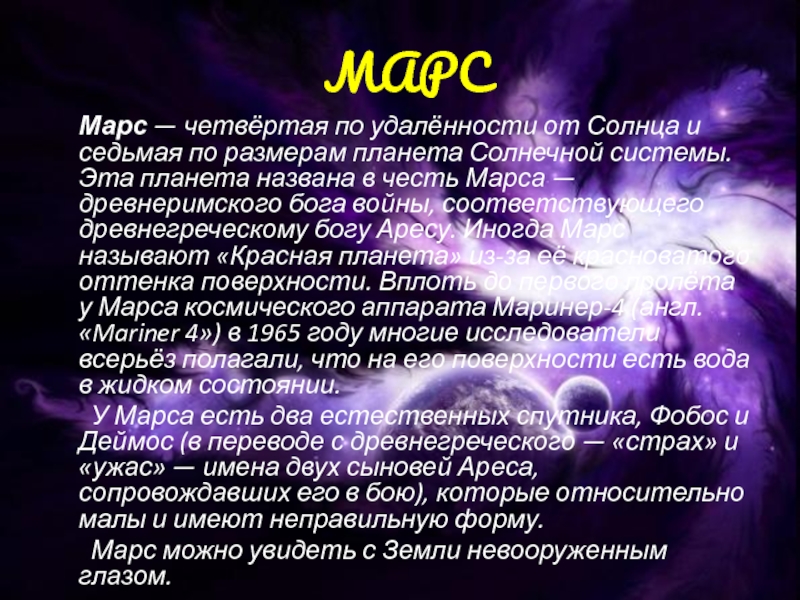 по размерам планета Солнечной системы. Эта планета названа в честь Марса — древнеримского бога войны, соответствующего древнегреческому богу Аресу. Иногда Марс называют «Красная планета» из-за её красноватого оттенка поверхности. Вплоть до первого пролёта у Марса космического аппарата Маринер-4 (англ. «Mariner 4») в 1965 году многие исследователи всерьёз полагали, что на его поверхности есть вода в жидком состоянии.