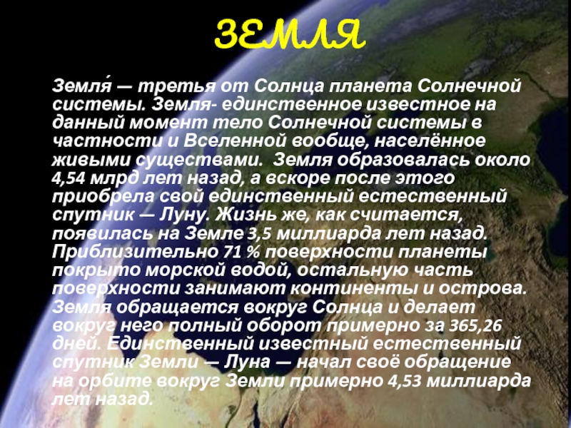 Земля- единственное известное на данный момент тело Солнечной системы в частности и Вселенной вообще, населённое живыми существами. Земля образовалась около 4,54 млрд лет назад, а вскоре после этого приобрела свой единственный естественный спутник — Луну. Жизнь же, как считается, появилась на Земле 3,5 миллиарда лет назад. Приблизительно 71 % поверхности планеты покрыто морской водой, остальную часть поверхности занимают континенты и острова. Земля обращается вокруг Солнца и делает вокруг него полный оборот примерно за 365,26 дней. Единственный известный естественный спутник Земли — Луна — начал своё обращение на орбите вокруг Земли примерно 4,53 миллиарда лет назад.