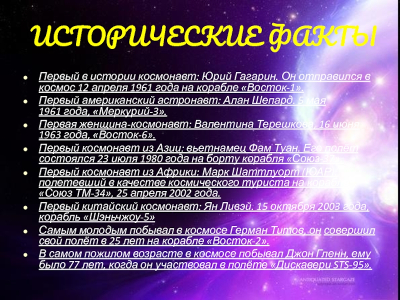 Самым молодым побывал в космосе Герман Титов, он совершил свой полёт в 25 лет на корабле «Восток-2».