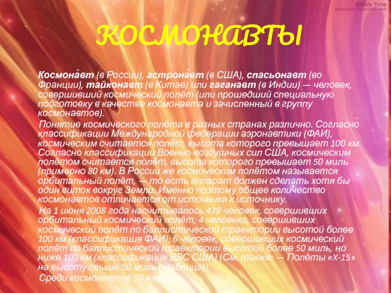 Франции), тайконавт (в Китае) или гаганавт (в Индии) — человек, совершивший космический полёт (или прошедший специальную подготовку в качестве космонавта и зачисленный в группу космонавтов).