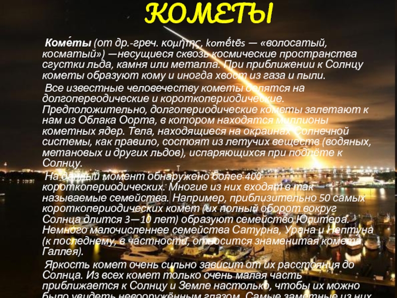Коме́ты (от др.-греч. κομήτης, komḗtēs — «волосатый, косматый») —несущиеся