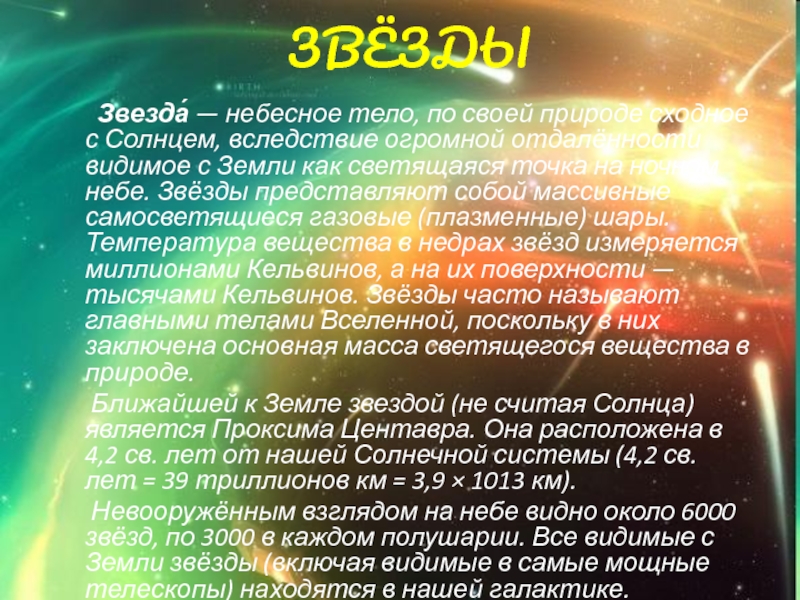 сходное с Солнцем, вследствие огромной отдалённости видимое с Земли как светящаяся точка на ночном небе. Звёзды представляют собой массивные самосветящиеся газовые (плазменные) шары. Температура вещества в недрах звёзд измеряется миллионами Кельвинов, а на их поверхности — тысячами Кельвинов. Звёзды часто называют главными телами Вселенной, поскольку в них заключена основная масса светящегося вещества в природе.