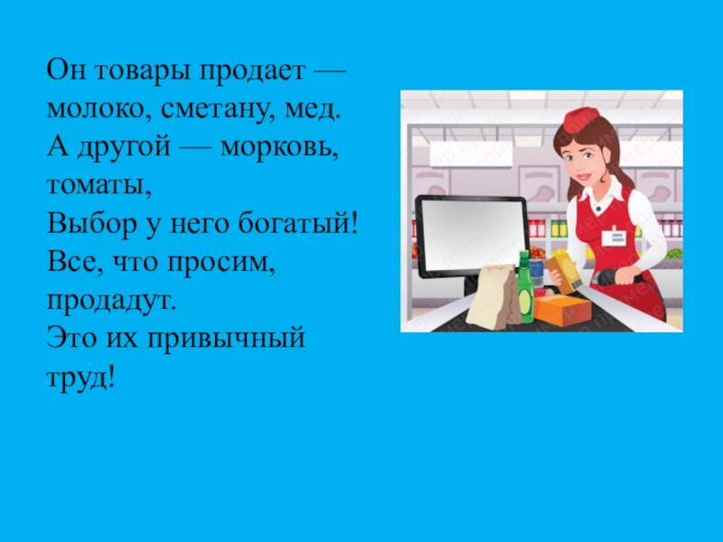 Он товары продает — молоко, сметану, мед.А другой — морковь, томаты,Выбор у него богатый!Все, что просим, продадут.Это