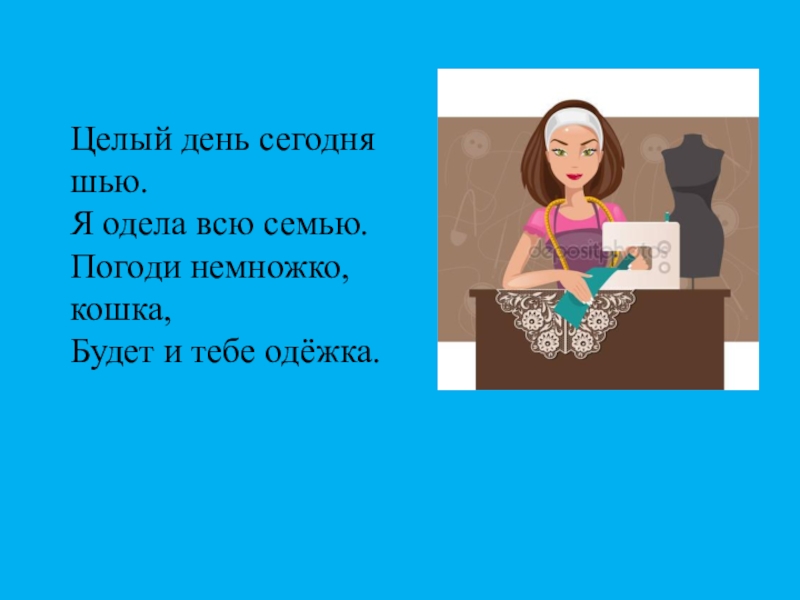 Слайд 11Целый день сегодня шью. Я одела всю семью. Погоди немножко, кошка, Будет и