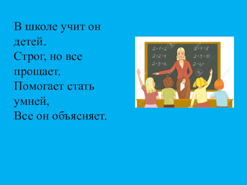 Слайд 8В школе учит он детей. Строг, но все прощает. Помогает стать умней, Все он