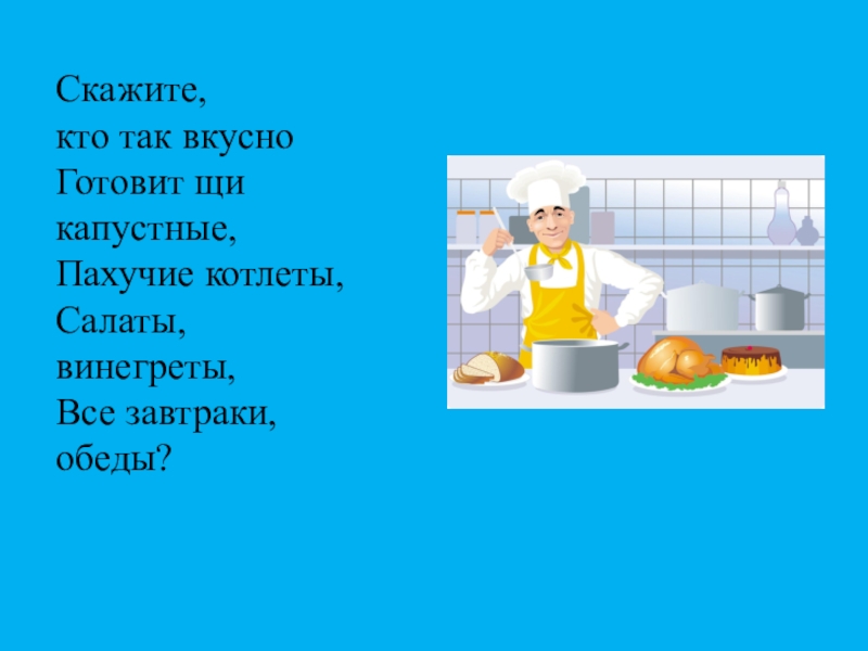 Скажите, кто так вкусно  Готовит щи капустные,  Пахучие котлеты,  Салаты, винегреты,  Все завтраки, обеды?