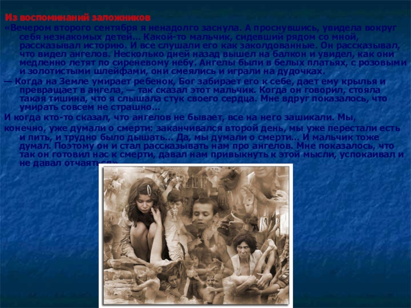конечно, уже думали о смерти: заканчивался второй день, мы уже перестали есть и пить, и трудно было дышать... Да, мы думали о смерти... И мальчик тоже думал. Поэтому он и стал рассказывать нам про ангелов. Мне показалось, что так он готовил нас к смерти, давал нам привыкнуть к этой мысли, успокаивал и не давал отчаяться»