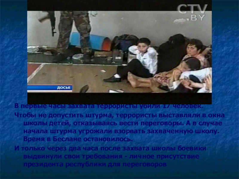 Слайд 11В первые часы захвата террористы убили 17 человек.