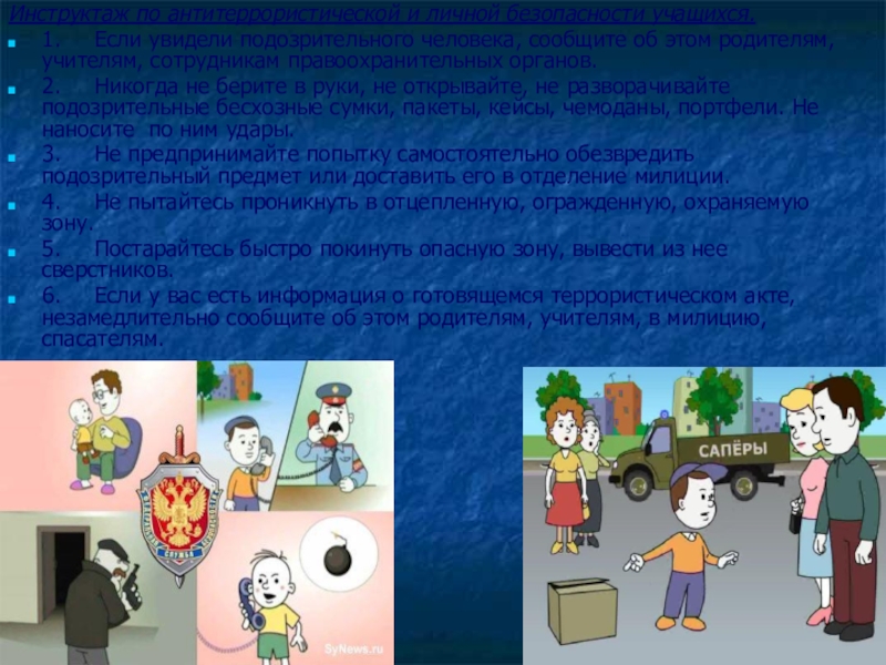 6. Если у вас есть информация о готовящемся террористическом акте, незамедлительно сообщите об этом родителям, учителям, в милицию, спасателям.