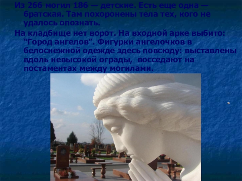 Слайд 23Из 266 могил 186 — детские. Есть еще одна — братская.