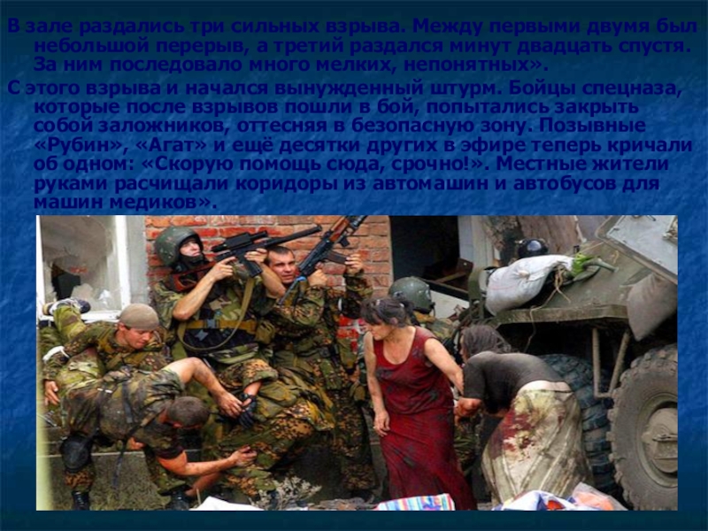 С этого взрыва и начался вынужденный штурм. Бойцы спецназа, которые после взрывов пошли в бой, попытались закрыть собой заложников, оттесняя в безопасную зону. Позывные «Рубин», «Агат» и ещё десятки других в эфире теперь кричали об одном: «Скорую помощь сюда, срочно!». Местные жители руками расчищали коридоры из автомашин и автобусов для машин медиков».