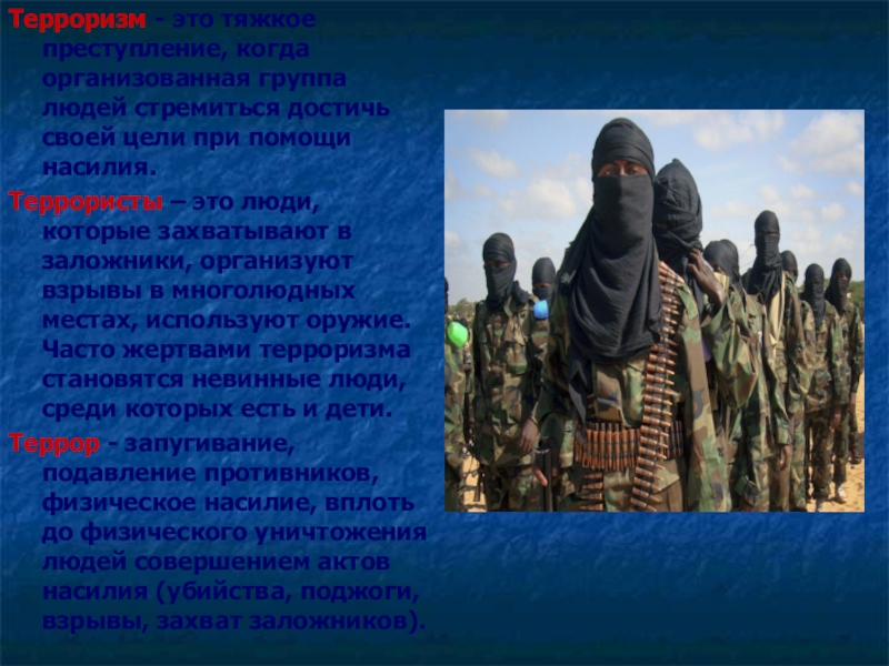 Слайд 2Терроризм - это тяжкое преступление, когда организованная группа людей стремиться достичь