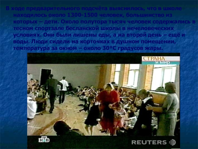 человек, большинство из которых – дети. Около полутора тысяч человек содержались в тесном спортзале бесланской школы в нечеловеческих условиях. Они были лишены еды, а на второй день – ещё и воды. Люди сидели на корточках в душном помещении, температура за окном – около 30ºС градусов жары.