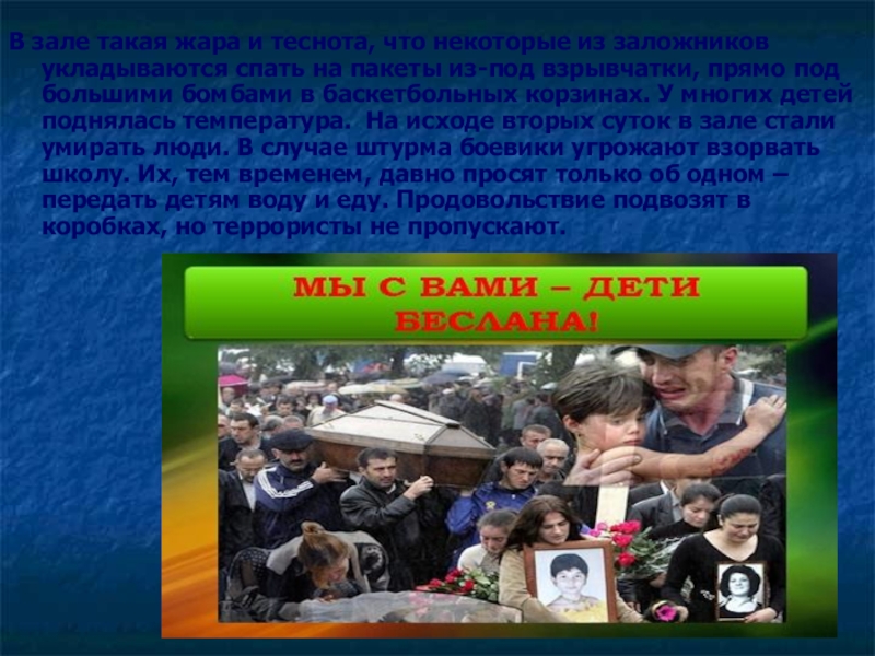 спать на пакеты из-под взрывчатки, прямо под большими бомбами в баскетбольных корзинах. У многих детей поднялась температура. На исходе вторых суток в зале стали умирать люди. В случае штурма боевики угрожают взорвать школу. Их, тем временем, давно просят только об одном – передать детям воду и еду. Продовольствие подвозят в коробках, но террористы не пропускают.