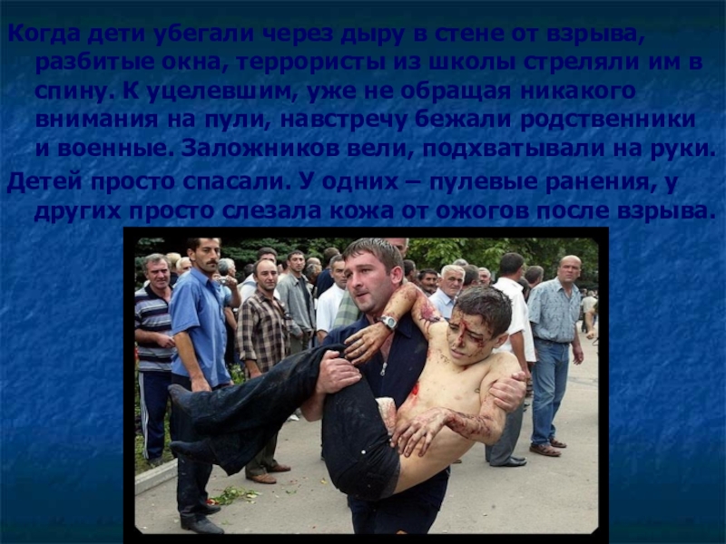 террористы из школы стреляли им в спину. К уцелевшим, уже не обращая никакого внимания на пули, навстречу бежали родственники и военные. Заложников вели, подхватывали на руки.
