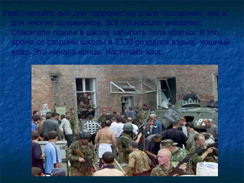 Слайд 16Утро третьего дня для террористов стало последним, как и для многих