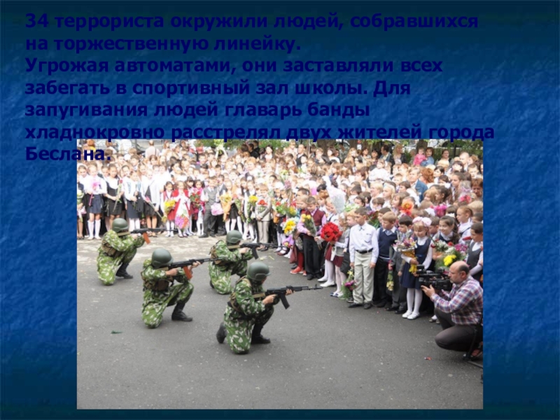 Слайд 834 террориста окружили людей, собравшихся на торжественную линейку.