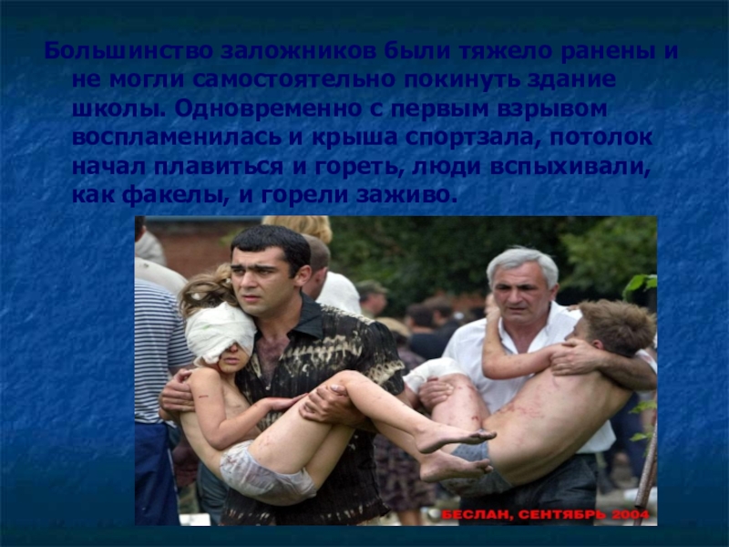Слайд 19Большинство заложников были тяжело ранены и не могли самостоятельно покинуть здание