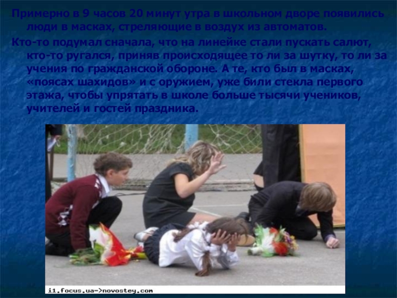 Кто-то подумал сначала, что на линейке стали пускать салют, кто-то ругался, приняв происходящее то ли за шутку, то ли за учения по гражданской обороне. А те, кто был в масках, «поясах шахидов» и с оружием, уже били стекла первого этажа, чтобы упрятать в школе больше тысячи учеников, учителей и гостей праздника.