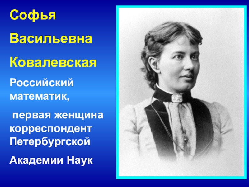 СофьяВасильевнаКовалевская Российский математик, первая женщина корреспондент ПетербургскойАкадемии Наук