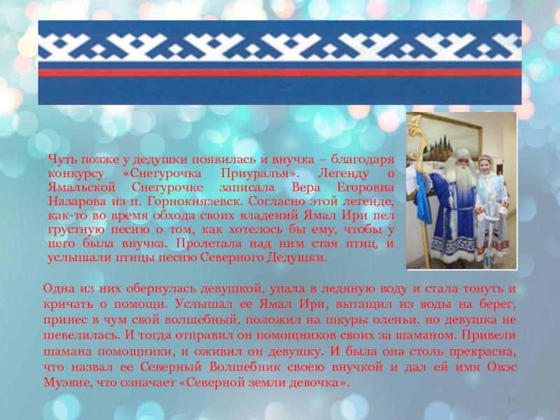 Приуралья». Легенду о Ямальской Снегурочке записала Вера Егоровна Назарова из п. Горнокнязевск. Согласно этой легенде, как-то во время обхода своих владений Ямал Ири пел грустную песню о том, как хотелось бы ему, чтобы у него была внучка. Пролетала над ним стая птиц, и услышали птицы песню Северного Дедушки.