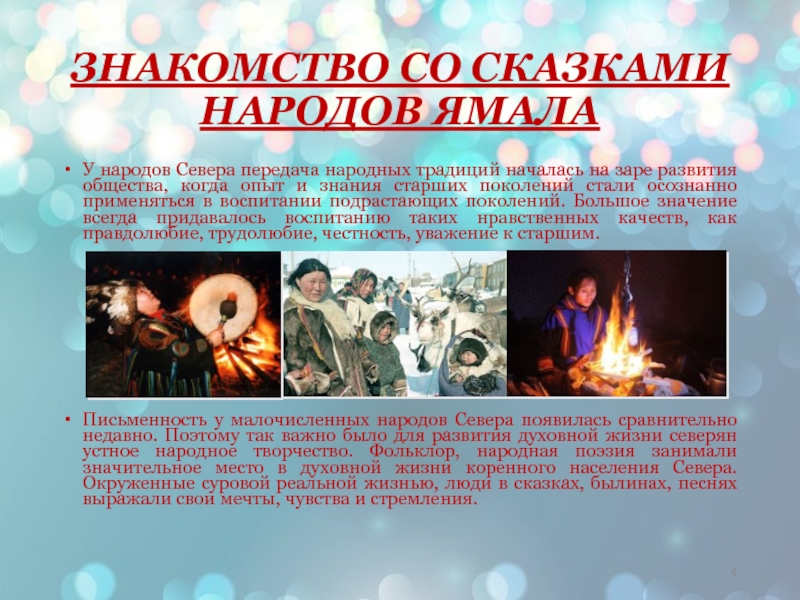 Слайд 4ЗНАКОМСТВО СО СКАЗКАМИ НАРОДОВ ЯМАЛА