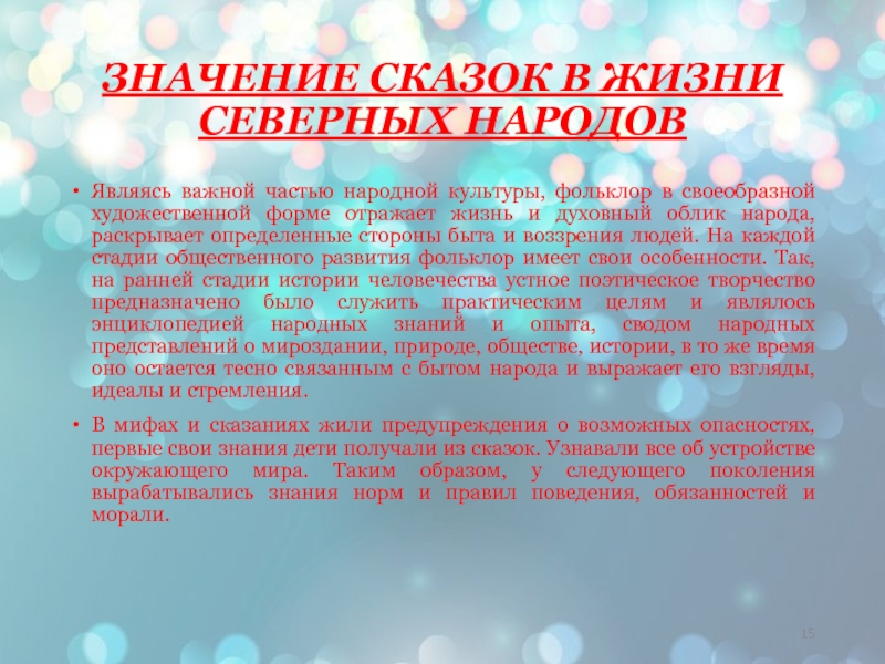 Слайд 15ЗНАЧЕНИЕ СКАЗОК В ЖИЗНИ СЕВЕРНЫХ НАРОДОВ