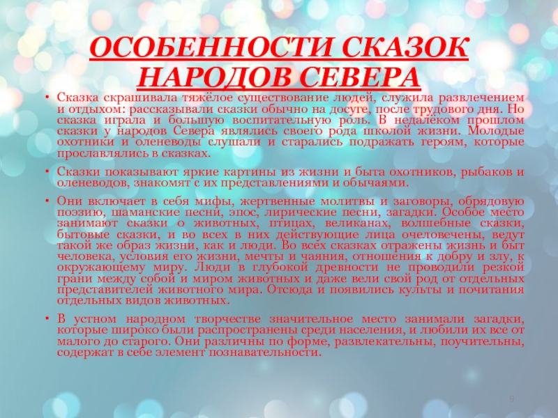 Слайд 9ОСОБЕННОСТИ СКАЗОК НАРОДОВ СЕВЕРА