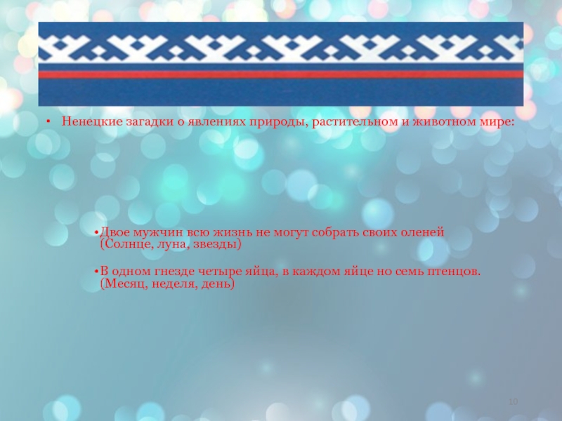 Слайд 10 Ненецкие загадки о явлениях природы, растительном и животном мире: