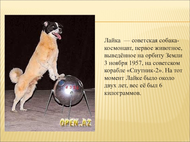 Лайка — советская собака-космонавт, первое животное, выведённое на орбиту Земли 3