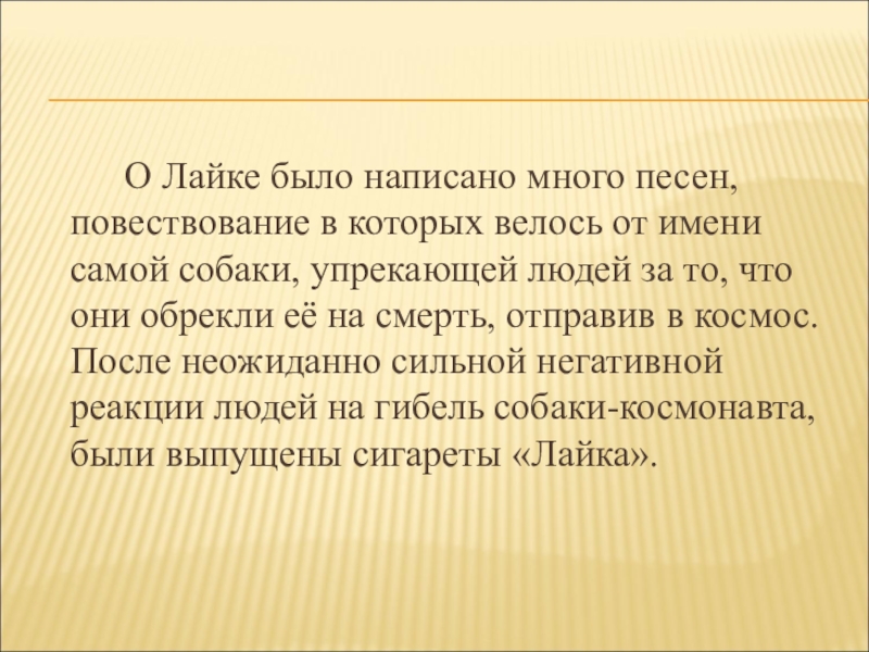 велось от имени самой собаки, упрекающей людей за то, что они обрекли её на смерть, отправив в космос. После неожиданно сильной негативной реакции людей на гибель собаки-космонавта, были выпущены сигареты «Лайка».