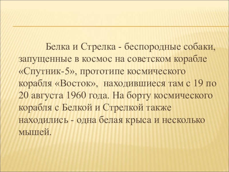 беспородные собаки, запущенные в космос на советском корабле «Спутник-5», прототипе космического корабля «Восток», находившиеся там с 19 по 20 августа 1960 года. На борту космического корабля с Белкой и Стрелкой также находились - одна белая крыса и несколько мышей.