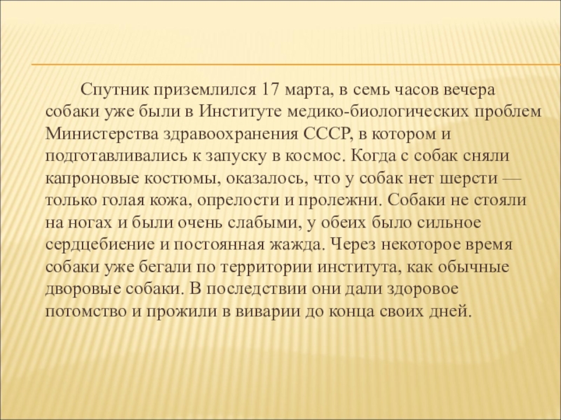 уже были в Институте медико-биологических проблем Министерства здравоохранения СССР, в котором и подготавливались к запуску в космос. Когда с собак сняли капроновые костюмы, оказалось, что у собак нет шерсти — только голая кожа, опрелости и пролежни. Собаки не стояли на ногах и были очень слабыми, у обеих было сильное сердцебиение и постоянная жажда. Через некоторое время собаки уже бегали по территории института, как обычные дворовые собаки. В последствии они дали здоровое потомство и прожили в виварии до конца своих дней.