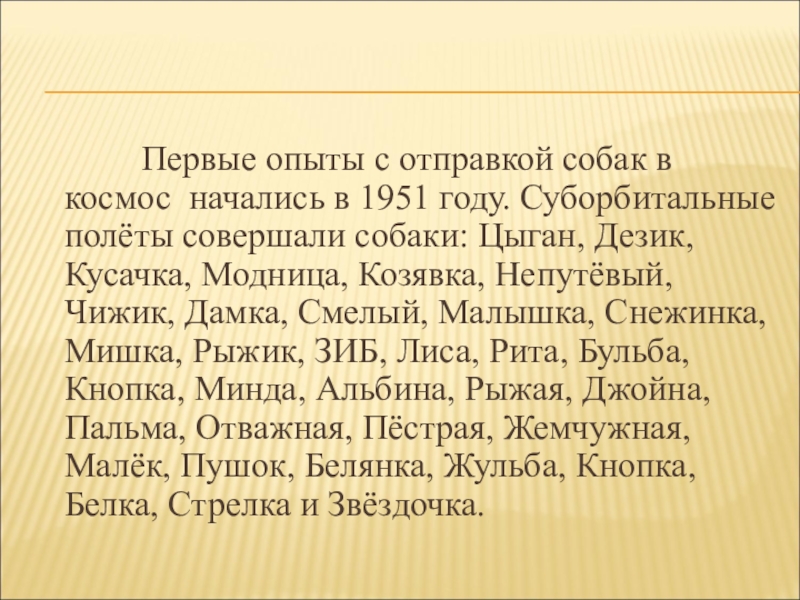 в космос начались в 1951 году. Суборбитальные полёты совершали собаки: Цыган, Дезик, Кусачка, Модница, Козявка, Непутёвый, Чижик, Дамка, Смелый, Малышка, Снежинка, Мишка, Рыжик, ЗИБ, Лиса, Рита, Бульба, Кнопка, Минда, Альбина, Рыжая, Джойна, Пальма, Отважная, Пёстрая, Жемчужная, Малёк, Пушок, Белянка, Жульба, Кнопка, Белка, Стрелка и Звёздочка.