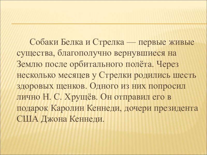 вернувшиеся на Землю после орбитального полёта. Через несколько месяцев у Стрелки родились шесть здоровых щенков. Одного из них попросил лично Н. С. Хрущёв. Он отправил его в подарок Каролин Кеннеди, дочери президента США Джона Кеннеди.