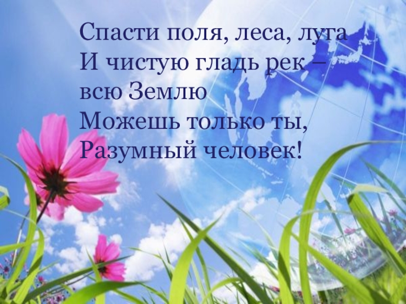 Спасти поля, леса, луга И чистую гладь рек – всю Землю Можешь только ты, Разумный человек!