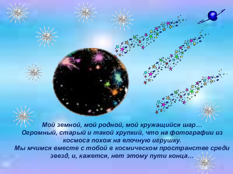 Мой земной, мой родной, мой кружащийся шар… Огромный, старый и такой хрупкий, что на фотографии из космоса
