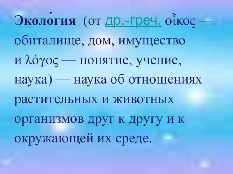 Эколо́гия  (от др.-греч. οἶκος — обиталище, дом, имущество и λόγος — понятие, учение, наука) — наука об отношениях