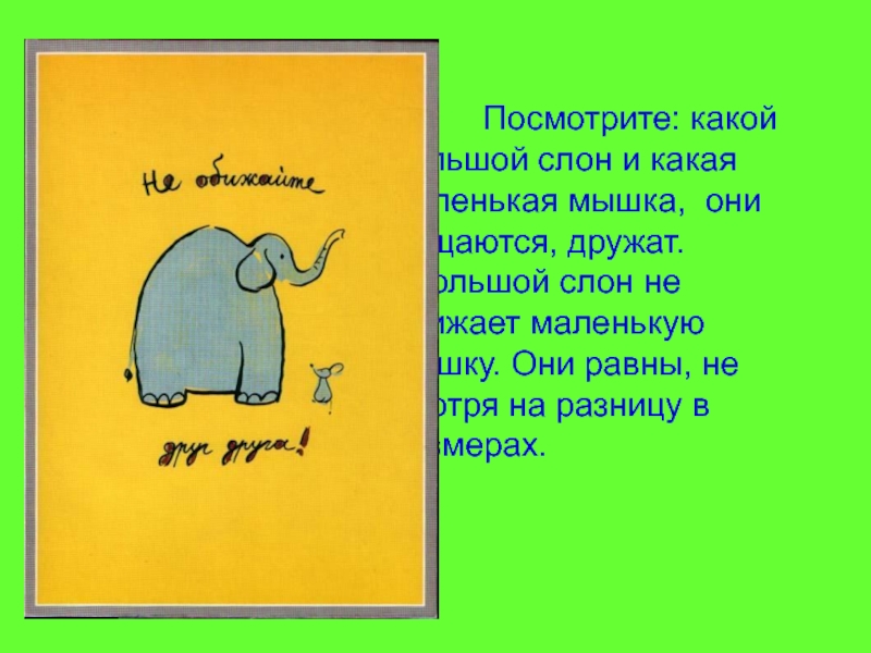 Большой слон не обижает маленькую мышку. Они равны, не смотря на разницу в размерах.