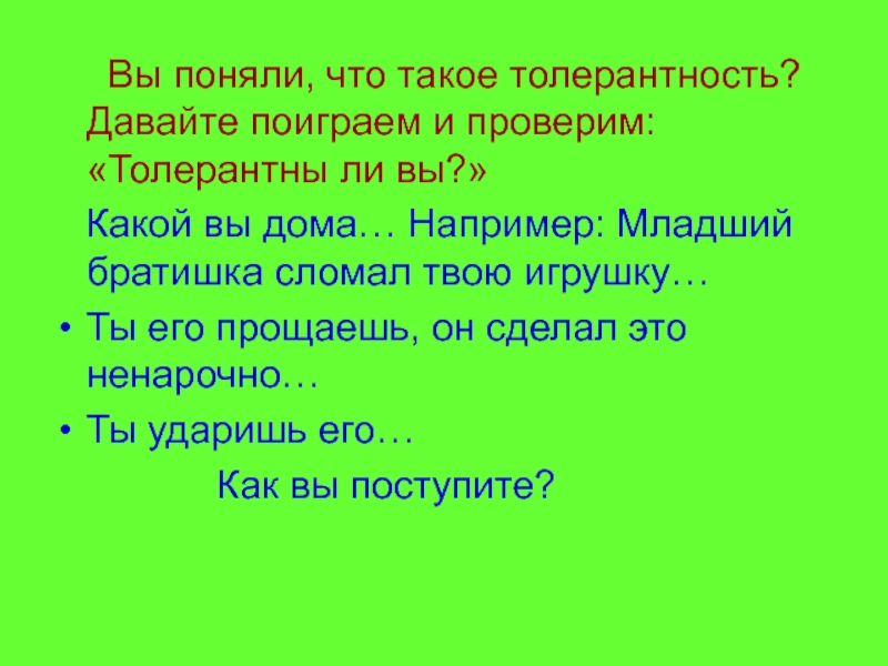 Слайд 10 Вы поняли, что такое толерантность? Давайте поиграем и