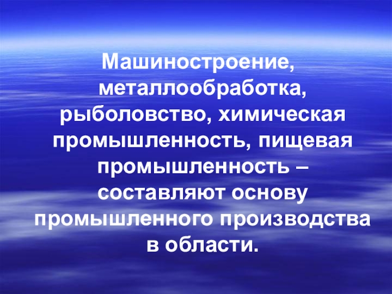 Машиностроение, металлообработка, рыболовство, химическая промышленность, пищевая промышленность – составляют основу промышленного производства в области.