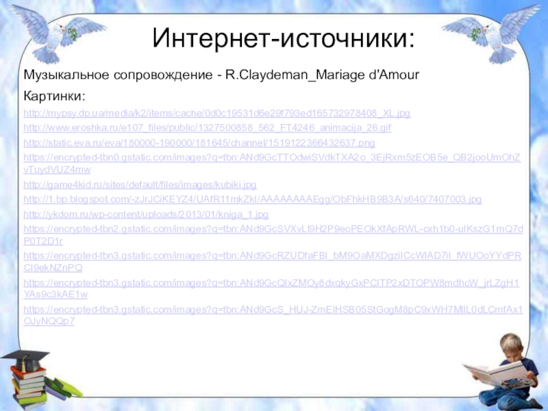 Интернет-источники:Музыкальное сопровождение - R.Claydeman_Mariage d'AmourКартинки:http://mypsy.dp.ua/media/k2/items/cache/0d0c19531d6e29f793ed165732978408_XL.jpghttp://www.eroshka.ru/e107_files/public/1327500858_562_FT4246_animacija_26.gifhttp://static.eva.ru/eva/180000-190000/181645/channel/1519122366432637.pnghttps://encrypted-tbn0.gstatic.com/images?q=tbn:ANd9GcTTOdwiSVdkTXA2o_3EjRxm5zEOB5e_QB2jooUmOhZvTuydVUZ4mwhttp://game4kid.ru/sites/default/files/images/kubiki.jpghttp://1.bp.blogspot.com/-zJrJCiKEYZ4/UAfR11mkZkI/AAAAAAAAEgg/ObFhkHB9B3A/s640/7407003.jpghttp://ykdom.ru/wp-content/uploads/2013/01/kniga_1.jpghttps://encrypted-tbn2.gstatic.com/images?q=tbn:ANd9GcSVXvLl9H2P9eoPEOkXfApRWL-cxh1b0-uIKszG1mQ7dP0T2D1rhttps://encrypted-tbn3.gstatic.com/images?q=tbn:ANd9GcRZUDfaFBI_bM9OaMXDgziICcWlAD7iI_fWUOoYYdPRCI9ekNZnPQhttps://encrypted-tbn3.gstatic.com/images?q=tbn:ANd9GcQIxZMOy8dxqkyGxPCITP2xDTOPW8mdhcW_jrLZgH1YAs9c3kAE1whttps://encrypted-tbn3.gstatic.com/images?q=tbn:ANd9GcS_HUJ-ZmEIHSB05StGogM8pC9xWH7MllL0dLCmfAx1OJyNQQp7