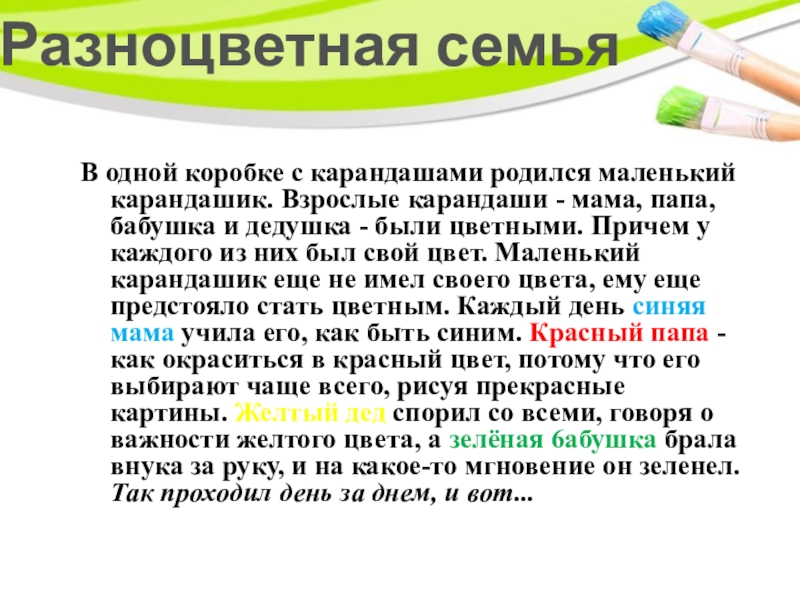 Разноцветная семьяВ одной коробке с карандашами родился маленький карандашик. Взрослые карандаши - мама, папа, бабушка и дедушка