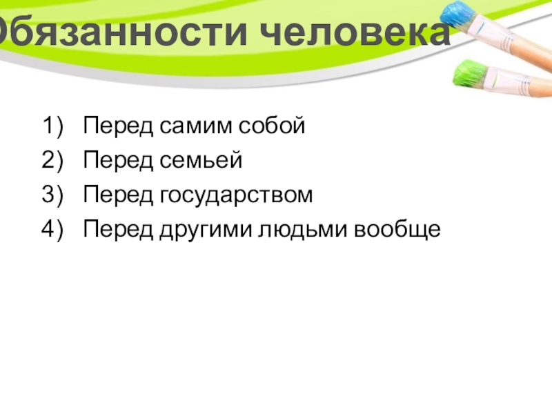 Обязанности человекаПеред самим собойПеред семьейПеред государствомПеред другими людьми вообще